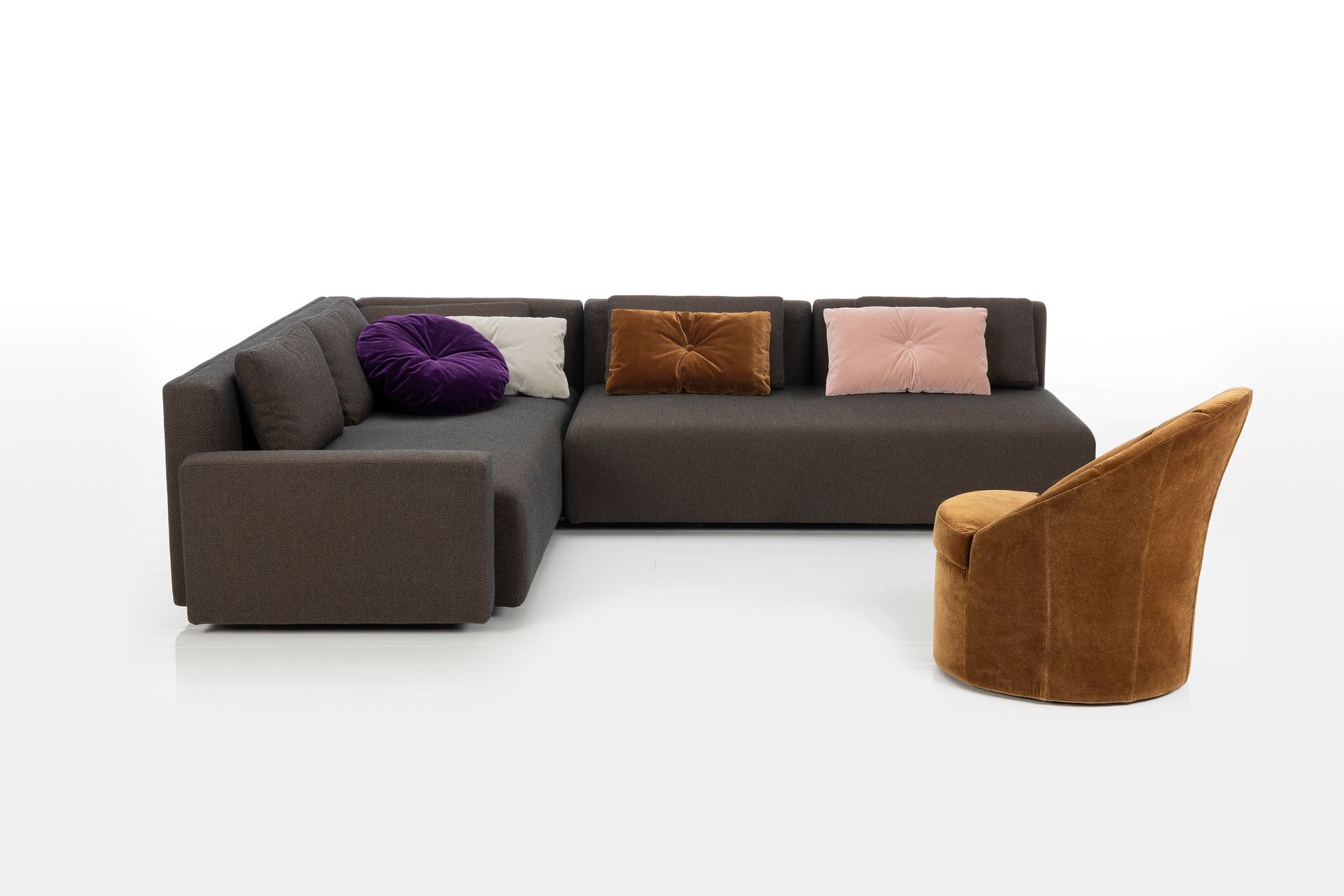 Lose Rückenkissen in der Farbe des Sofabezugs werden durch Kissen mit Knopfheftung ergänzt, die aus einer Kollektion von Veloursstoffen in 39 Farben individuell ausgewählt werden können. Die bodennahe Sitzbasis sorgt für Leichtigkeit. Die Bezüge sind abziehbar und erneuerbar.