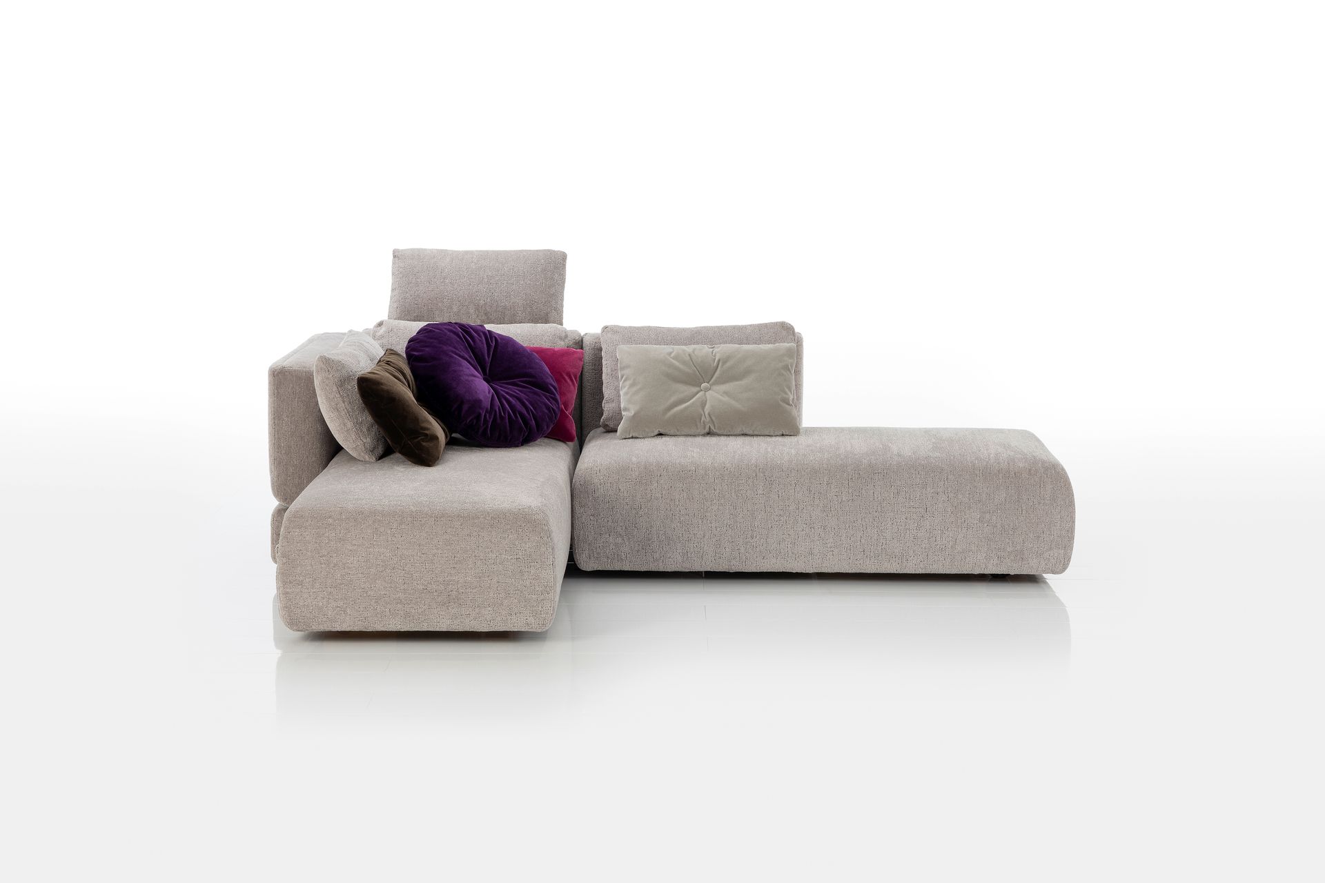 Das variable System aus Longchair und Drehsofa bietet vielseitige Verwandlungsoptionen zum Loungen und Schlafen